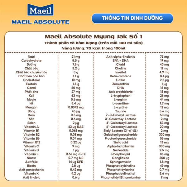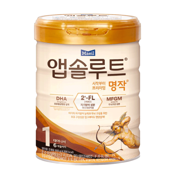 Maeil Absolute số 1 là dòng sữa công thức hỗ trợ sự phát triển toàn diện cho trẻ nhỏ từ 0 – 6 tháng tuổi. Sản phẩm với công thức gần với tiêu chuẩn vàng sữa mẹ: chứa 6 chủng miễn dịch HMO trong đó 2’FL là thành phần độc quyền đầu tiên tại Hàn Quốc, giúp tăng cường đề kháng cho trẻ. Cùng bộ 3 MFGM + DHA + Lutein hỗ trợ tối đa sự hoàn thiện trí não và thị giác.